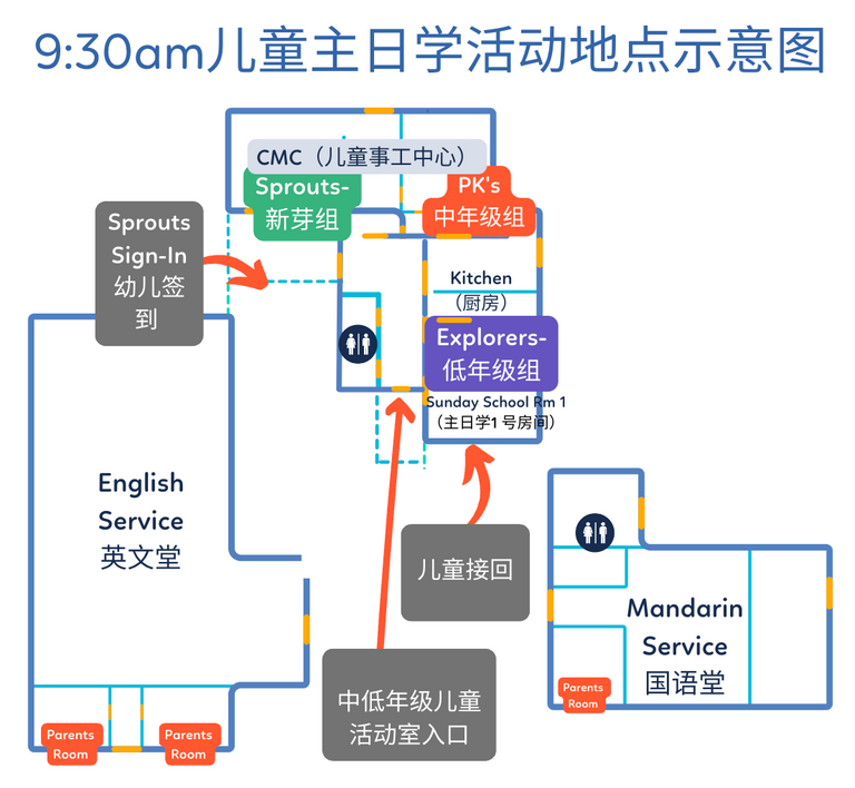 - 低龄新芽组幼童(学前班以前),请家长亲自带至儿童事工中心(CMC),签到后进入。
